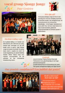 Hierbij de nieuwe flyer van vocal group Sjonge Jonge o.l.v. dirigent Akke Bosma! Wij hebben een prachtig gevarieerd programma in de lichte muziek en presenteren onszelf in november/december ook graag als kerstkoor.